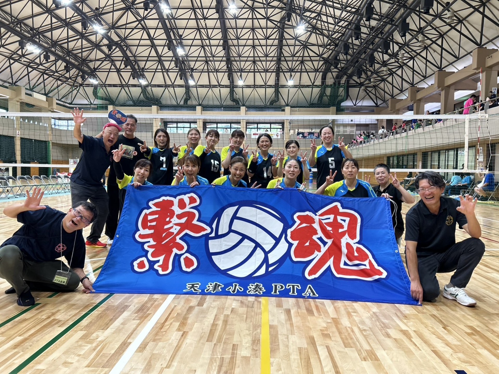 安房東中・天津小湊小合同チームは、1試合目を危なげなく快勝すると、グループ最後の2試合目は強豪の千倉と対戦。 第1セットを接戦の末、奪取! 第2セットもリードを奪うが、終盤逆転を許し、フルセットの戦いへ!(2セット先取制) 第3セットはデュースもなく、15点に到達したチームが勝利する。 序盤、リードするも、中盤逆転され、11−14と、あと1点で敗退の崖っぷち。 そこから、天津小湊のママたちの強靭なメンタルが発揮された。 なんと4点を連続でとり、大逆転勝利!! これで、グループ1位となり、準決勝に駒を進めた。
