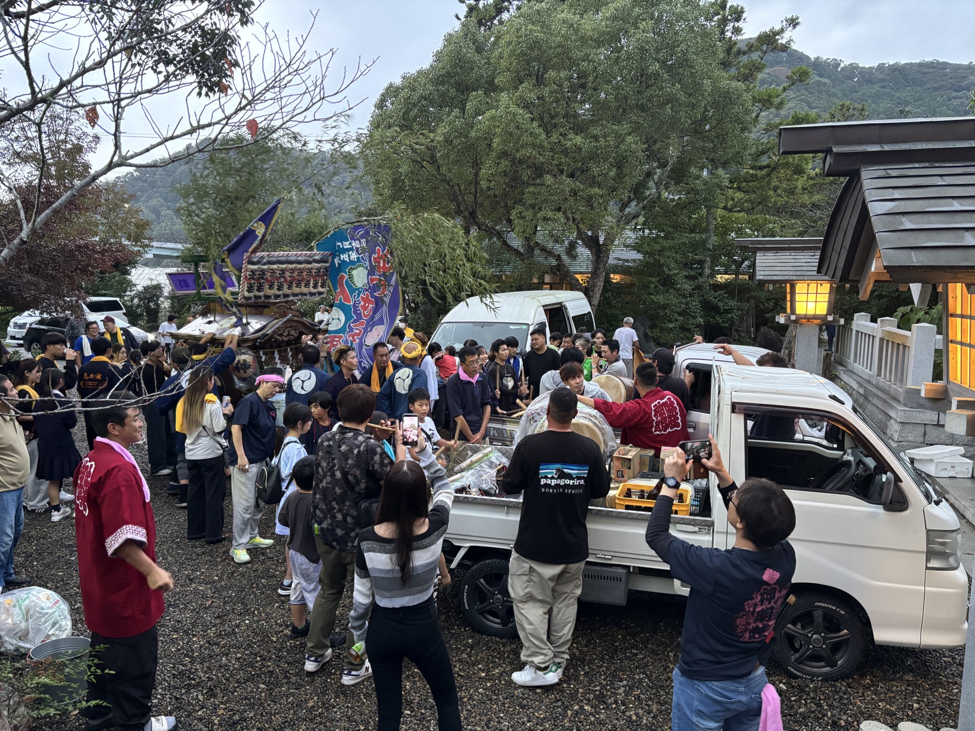 と、午後4時半ごろ、どこからか囃子太鼓が聞こえてくる。 空耳か、と疑ったが、なんと、町内の判断で万燈を出していた芝町が、せっかくだったら、神明神社まで行ってしまおうと勢いでやってきたのだ。しかも、途中で出会った町内を巻き込み、巻き込み、軽トラに太鼓を載せた即席万燈まで。まるでドラクエ状態。笑 ミニ神輿もやってきて、境内へ……。 まさかのにぎわい。子どもから大人までの笑顔が弾ける。